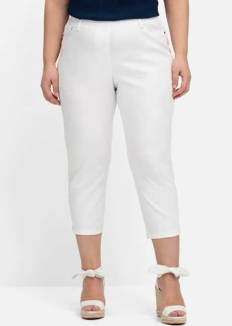 Schmale Twillhose in 7/8-Länge. Durch den breiten Gummibund sitzt die Hose sehr bequem, Gürtelschlaufen sorgen dabei für den gepflegten Auftritt. Sie ist in klassischer Five-Pocket-Form gearbeitet, die Münztasche ziert eine farbige Naht. Dazu kommen aufgesetzte Taschen hinten.