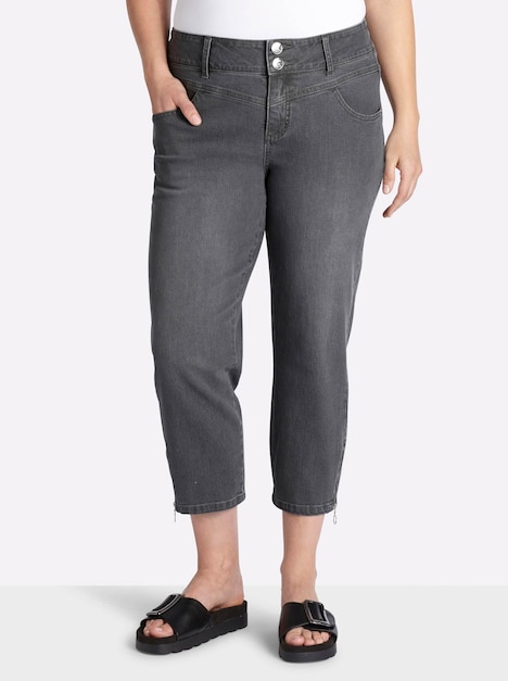 Schmale Jeans in 7/8-Länge. Modisches Detail ist der Zipper am Saum. Der Bund ist mit zwei Knöpfen, Reißverschluss und Gürtelschlaufen gearbeitet. Dazu kommen die klassischen fünf Taschen sowie eine leichte Waschung auf der Vorderseite der Beine.