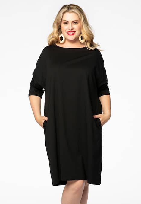 Ein kleines schwarzes Basic-Kleid aus weicher Baumwolle. Das Kleid hat Taschen, mittellange Ärmel und eine lockere Passform.