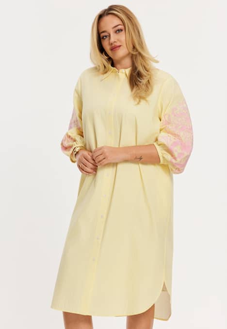 Dieses gestreifte Blusenkleid mit romantischem Twist wird ohne Zweifel dein neuer Favorit! Die zartgelben und weißen Streifen sorgen für eine frische Ausstrahlung, während die rosa Stickerei an den Ärmeln eine verspielte, feminine Note verleiht. Das Kleid hat eine weite Passform und trägt sich wunderbar angenehm. Mit klassischem Hemdkragen, durchgehender Knopfleiste und leicht gerafften Manschetten für dezentes Volumen. Trage es als Kleid oder offen als luftige Blusen-Cardigan über deinem Outfit.