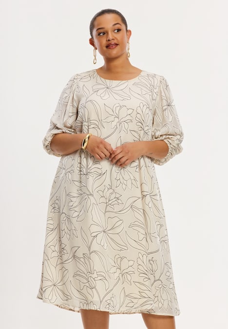 Wir sind überzeugt, dass Sie sich in dieses wunderschöne Kleid verlieben werden! Das Design ist aus einer Viskosemischung gefertigt, die sich luftig auf der Haut anfühlt. Der raffinierte Blumenprint in subtilen Cremetönen verleiht dem Piece eine zurückhaltende, aber luxuriöse Ausstrahlung. Das Modell besitzt eine schwungvolle Silhouette, die sich bei jedem Schritt mitbewegt und perfekt für besondere Anlässe ist. Ausgestattet mit leicht gepufften Dreiviertelärmeln und vollständig gefüttert, mit Ausnahme der Ärmel.