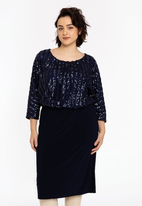 Dieses wunderschöne Kleid ist oben mit glitzernden Pailletten verziert. Das Oberteil hat dank des elastischen Taillenbands und der leicht gepufften Dreiviertelärmel einen verspielten, blusigen Effekt. Der untere Teil des Kleides besteht aus fließendem, einfarbigem Stoff in einem tiefen Marineblau. Durch seine Länge bis über das Knie eignet sich das Kleid für verschiedene Anlässe – vom schicken Abendessen bis zum Ausgehabend.
