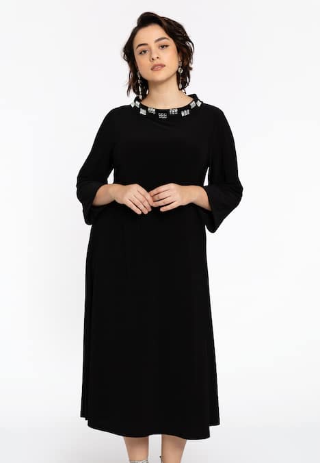 Dieses DOLCE-Kleid hat eine schmeichelhafte A-Linien-Passform. Der Stoff fühlt sich weich an und hat gerade genug Stretch für eine bequeme Passform. Der Blickfang ist der breite Stehkragen, der mit glitzernden Steinen verziert ist. Die Dreiviertelärmel sind leicht ausgestellt, was für einen eleganten und femininen Look sorgt. Tragen Sie es mit Absätzen und auffälligen Ohrringen für einen Abendlook oder kombinieren Sie es mit Stiefeletten für ein stilvolles Tagesoutfit.