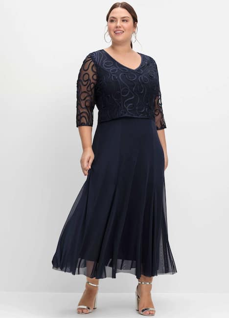Abendkleid mit floralem Alloverprint. Der unkomplizierte Casual-Look zeigt sich mit Rundhalsausschnitt, V-Schlitz und kurzer Knopfleiste. Die langen Ärmel enden mit Knopfmanschetten.