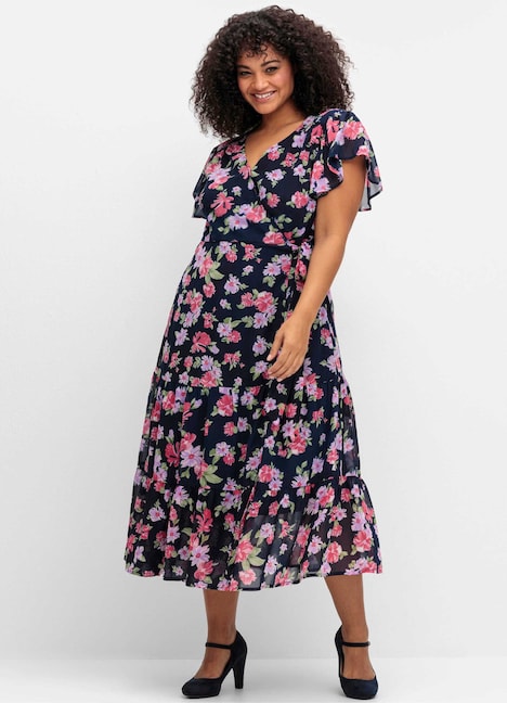 Chiffonkleid von sheego by Joe Browns. Der zarte Blumendruck wirkt verspielt und feminin, der überlappende V-Ausschnitt lässt eine schmeichelnde Wickeloptik entstehen. Semitransparente Flügelärmel mit Volant und ein weit schwingender, gewickelter Stufenrock setzen das Kleid zusätzlich in Szene. Mit dem seitlichen Bindegürtel wird die Körpermitte betont. Praktisch sind der nahtfeine Reißverschluss in der Seite sowie die nahtfeinen, schräg verlaufenden Eingrifftaschen.