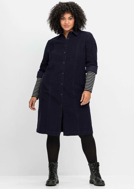 Hemdblusenkleid aus Feincord, in knieumspielender Länge. Das Kleid zeigt sich stilsicher mit Hemdblusenkragen, einer durchgehenden Knopfleiste und langen Manschettenärmeln. Besonders lässig wirkt der Look mit hochgekrempelten Ärmeln, die sich mit Riegel und Knopf fixieren lassen. Praktische Eingrifftaschen seitlich runden das Design perfekt ab.