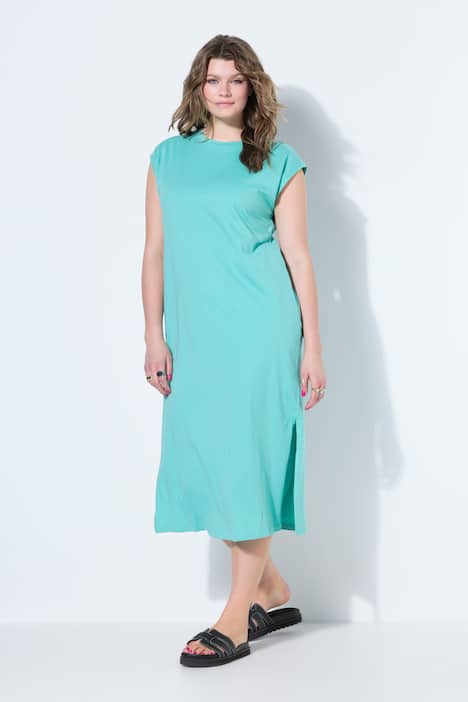 Jersey-Midikleid, leicht oversized, mit Rundhalsausschnitt, überschnittenen Schultern und langen Seitenschlitzen. Ärmellos.