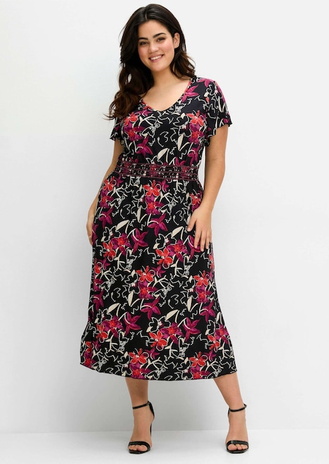 Jerseykleid mit floralem Druck. Die kurzen Flügelärmel wirken sommerlich leicht, im Rücken sorgen Zierbänder für Raffinesse. Die Taille wird durch einen elastischen Smokeinsatz betont, darunter schließt sich ein wadenlanges Rockteil an.