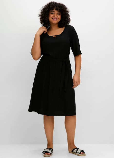 Jerseykleid mit abnehmbarem Bindegürtel. Dieses Kleid ist mit kurzen Ärmeln und einem Cut-out am Rundhalsausschnitt versehen. Besonders praktisch präsentieren sich die seitlichen Taschen.