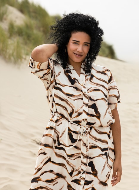 Dieses Kleid aus geschmeidiger Ecovero-Viskose hat einen durchgehenden Knopfverschluss, einen Rundhalsausschnitt und Seitenschlitze. Das strapazierfähige Material und die kurzen Ärmel machen es perfekt für den Sommer. Erhältlich in einem zeitlosen Animal-Print, mit einem Stoffgürtel für zusätzliche Form.