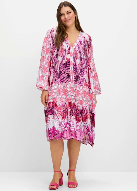 Stufenkleid im raffinierten Mustermix von sheego loves miss goodlife. Der V-Ausschnitt mit mittellanger Knopfleiste setzt sich stilvoll ab, während die langen Ballonärmel mit Gummizugbündchen dem Design eine romantische Note verleihen. Unterschiedlich gemusterte Rockstufen und die kniebedeckende Länge sorgen für femininen Schwung, die praktischen Seitentaschen bieten zusätzlichen Komfort.