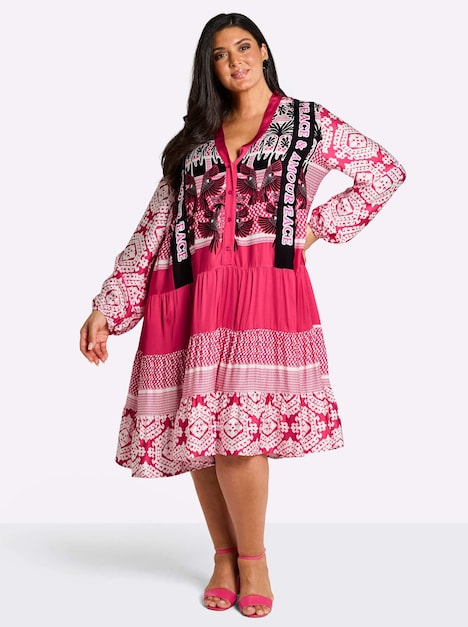 Kaskadenkleid im Mustermix von sheego loves miss goodlife. Der fantasievolle Druck wird mit modischen Wordingprints aufgepeppt. Ein tiefer V-Ausschnitt mit halblanger Knopfleiste setzt sich stilvoll ab, während die erhöhte Taillennaht in einen stufigen Rockteil übergeht und so den femininen Charme unterstreicht. Weite Ballonärmel mit elastischen Bündchen und der Kaskaden-Schnitt sorgen für eine dynamische Silhouette.