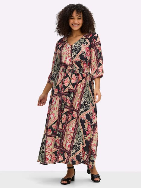 Langes Kleid von sheego by Joe Browns. Charmant wirkt der im Patchwork-Stil gehaltene florale Print, zu dem der Einsatz aus Spitze im Rücken eine harmonische Ergänzung ist. An den V-Ausschnitt schließt sich eine durchgehende Knopfleiste an, dazu kommen überschnittene 3/4-Ärmel und ein weit schwingender Rock. Der bequeme Smokbund lässt eine taillierte Form entstehen und betont so schmeichelnd die feminine Silhouette.