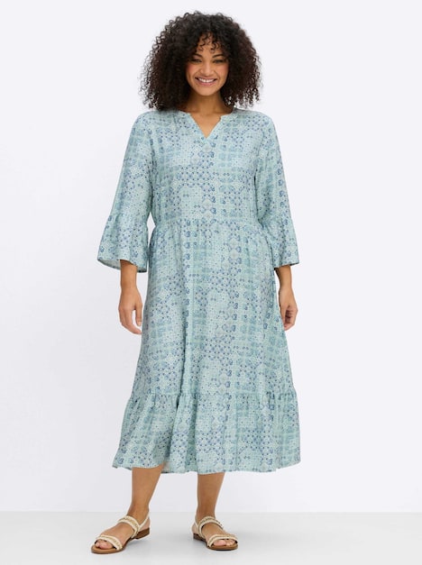 Midikleid mit Alloverprint. Der Rundhalsausschnitt ist mit offenem V-Schlitz gearbeitet, die weiten Trompetenärmel enden in 3/4-Länge. Durch die Taillennaht wird die Körpermitte dezent betont, der A-Linien-Rock erhält durch die Stufenvolants luftigen Schwung. Ein verdeckter Reißverschluss in der Seitennaht ergänzt den sommerlichen Lieblingslook.
