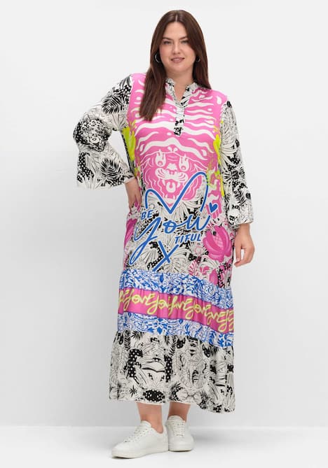 Maxikleid von sheego loves miss goodlife. Der Ausschnitt ist mit kleinem Stehkragen, V-Schlitz und kurzer Knopfleiste gearbeitet. Der farbenfrohe Print wird mit positiven Statements verstärkt und sorgt so für einen stilbewussten Auftritt. Ein breiter Volant an den weiten, 3/4-langen Ärmeln sowie der stufige Volant am Saum runden das Design romantisch ab.