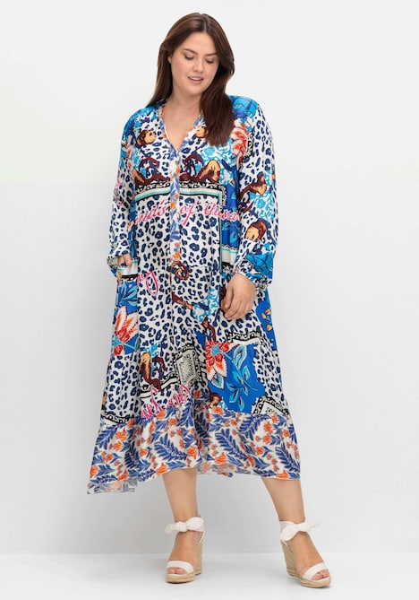 Maxikleid im farbenfrohen Mustermix von sheego loves miss goodlife. Die Volantstufen lassen das Kleid wunderbar luftig fallen und geben ihm gleichzeitig femininen Schwung. Der V-Ausschnitt geht in eine kurze Knopfleiste über. Die weiten Ballonärmel enden in elastischen Bündchen und unterstreichen den femininen Look.