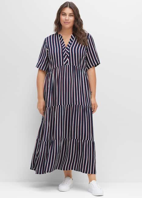 Maxikleid in Knöchellänge. Die Längsstreifen strecken optisch die Silhouette. Das zweifarbige Streifendessin und die entgegengesetzte Linienführung an den kurzen Ärmeln sowie am Ausschnitt brechen den Look modisch auf. Dank des stufigen Volants schwingt der Rock mit jedem Schritt schön mit.