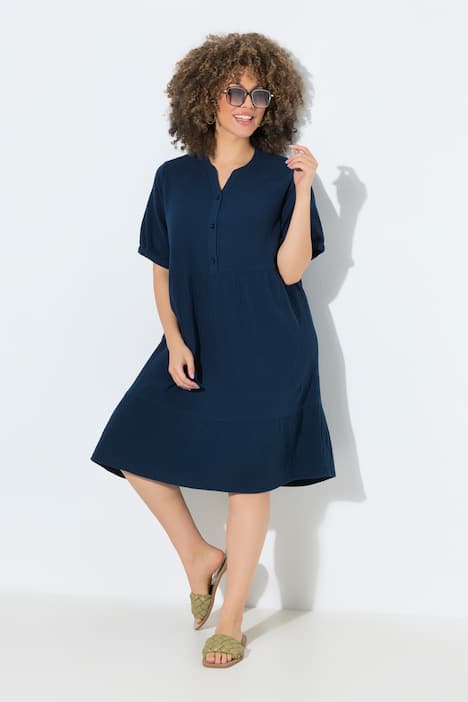 Musselin-Kleid, A-Linie, mit feiner Struktur und breitem Volant am Saum. Tunika-Ausschnitt mit kurzer Knopfleiste, gekräuselter Taille, Halbarm mit schmalen Manschetten.