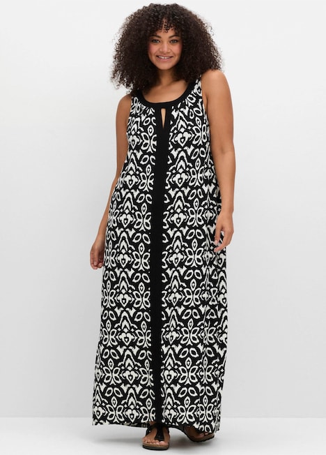 Ärmelloses Jerseykleid in Maxilänge. Der kontraststarke Ornamentdruck wirkt feminin und stilvoll. Ein senkrecht verlaufender unifarbener Einsatz setzt dazu einen spannenden Kontrast und streckt gleichzeitig geschickt die Silhouette. Der Rundhalsausschnitt wird durch Cut-outs vorn und hinten raffiniert ergänzt, ein kleines Metalllabel ziert den Nacken. Die dezente A-Linie endet mit einem leicht gerundeten Saum und fällt so locker über die Figur.