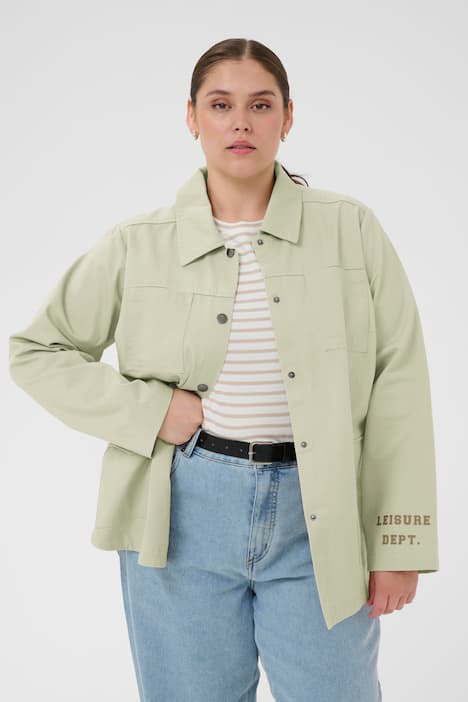 Diese Shacket zeigt einen geraden Schnitt, klassischen Hemdkragen und lange Ärmel. Die Vorderseite ist mit Knopfleiste und vier aufgesetzten Taschen gestaltet. Am Ärmel befindet sich ein "LEISURE DEPT." Schriftzug.