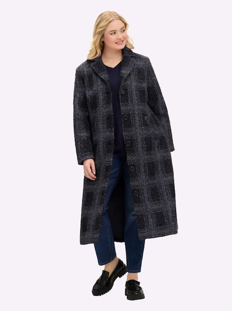 Karierter Blazermantel. Das großformatige Muster und die Bouclé-Oberfläche sorgen für Trendappeal. Der lange Schnitt mit Reverskragen und Knopfleiste lässt eine moderne Silhouette entstehen. Zwei Eingrifftaschen und eine Innentasche ergänzen den stilvollen Look.