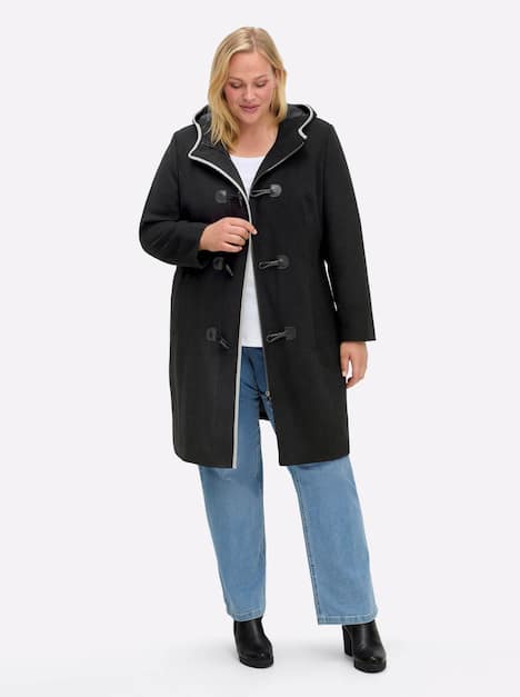 Wintermantel in Knielänge. Die feste Kapuze hält schön warm und wird mit kontrastfarbener Paspel modisch akzentuiert. Die Knebelverschlussleiste mit Kontrast-Paspel und der verdeckte Reißverschluss sorgen für eine geschlossene, winddichte Front und einen stilvollen Auftritt. Zwei Eingrifftaschen und eine Innentasche bieten praktischen Stauraum, während der Gehschlitz hinten für genügend Beinfreiheit sorgt.