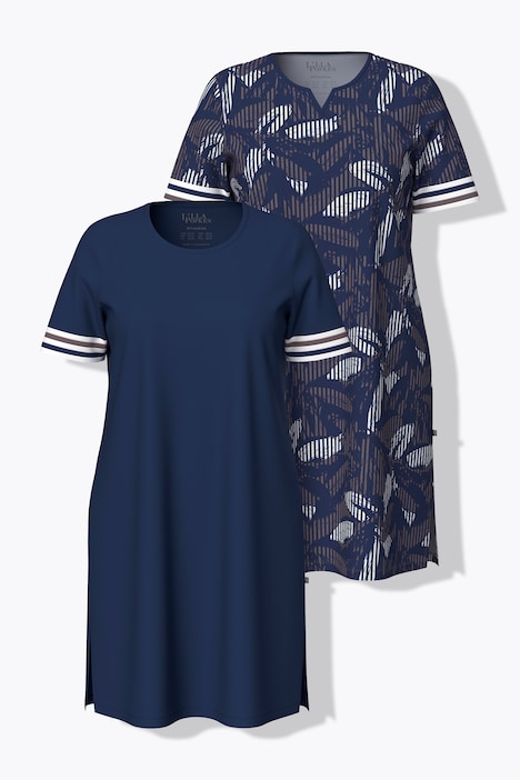 Fühl dich wohl in unseren Bigshirts im 2er-Pack. Je 1 x mit Tropical-Muster mit herzförmigem Ausschnitt und einfarbig mit Rundhalsausschnitt. Jedes Nachthemd hat einen Halbarm mit Ringelabschluss und Seitenschlitze für mehr Bewegungsfreiheit.