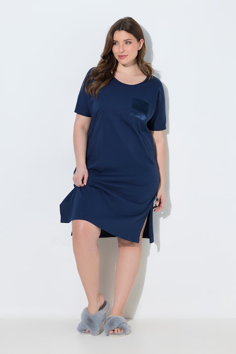 Nachthemd mit fein schimmernder Satin-Brusttasche. Weiter Rundhalsausschnitt, überschnittene Schultern, Halbarm. Seitenschlitze für glatten Fall und noch mehr Tragekomfort.
