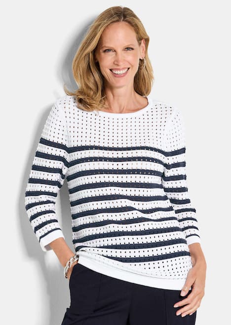 Pullover in luftigem Ajourstrick – der perfekte Kombi-Liebling für warme Tage! Das strukturierte Lochmuster mit kontrastfarbenen Ringeln lässt den Marine-Look wieder aufleben! In gerader Passform mit U-Boot-Ausschnitt, 3/4-Arm und flachen Abschlüssen. Trageangenehm dank hohem Baumwollanteil. Länge ca. 67 cm in Gr. 46, ca. 63 cm in Gr. 23.