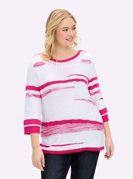 Die weiche Baumwoll-Mischung verwöhnt die Haut: Pullover im ausgefallenen Linksstrick-Dessin mit raffiniertem Lochmuster unterhalb des U-Boot-Ausschnitts. Die Abschlüsse der 3/4-Ärmel sind gerippt. Unterstützt die Initiative Cotton made in Africa.