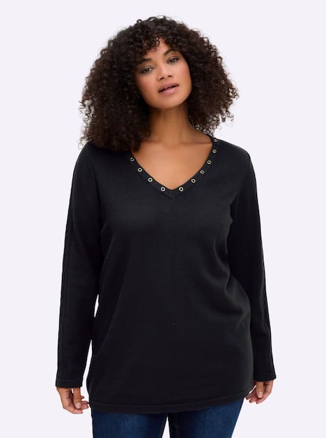 Dieser Strickpullover besticht mit Ajourmuster an den Ärmeln. Das langärmlige Oberteil erhält seinen einzigartigen Charakter durch einen tiefen V-Ausschnitt mit Ösenverzierung vorn.