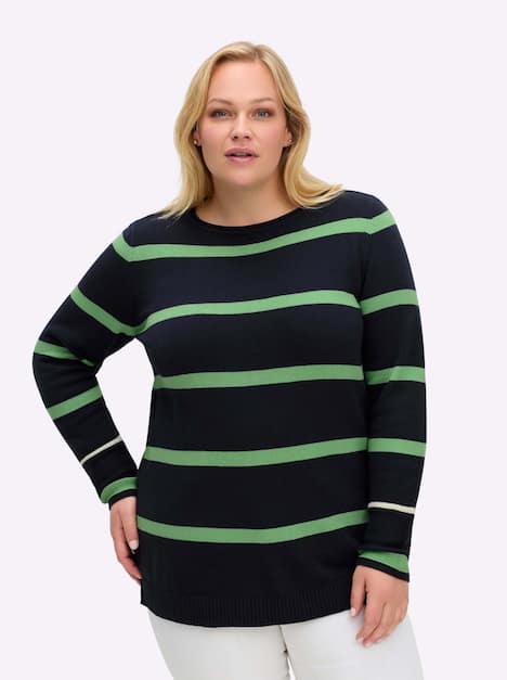 Langarmpullover mit fröhlichem Ringelmuster. Der Rundhalsausschnitt mit Rollkante verleiht dem Pullover eine legere Note, während die lockere Form mit geripptem Saumbund eine bequeme Passform bietet. Ideal für entspannte Tage.