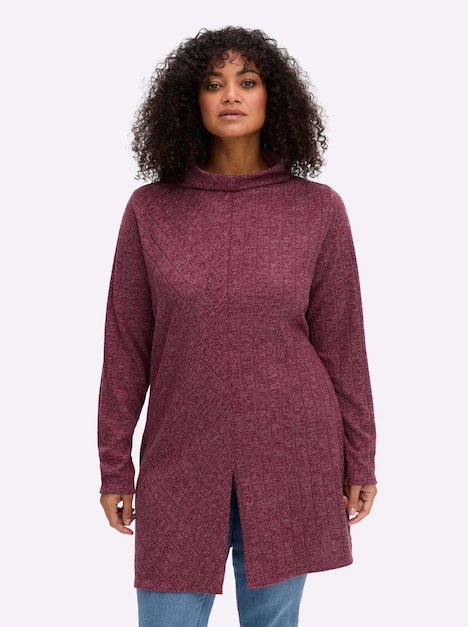 Longpullover mit Stehkragen von sheego by Joe Browns. Der hohe mittige Schlitz formt nicht nur eine raffinierte Silhouette, sondern sorgt auch für viel Bewegungsfreiheit. Dazu kommt ein spannender Strickmuster-Mix: Die breite Rippstruktur verläuft auf der einen Seite diagonal, auf der anderen senkrecht. Auch die langen Ärmel sind in breiter, vertikaler Rippstruktur gearbeitet.