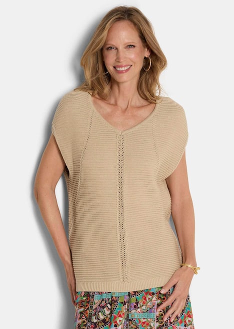 Pullover in schimmerndem Rippenstrick: Das Querrippenmuster wird durch streckende Längs- und Schräglinien elegant akzentuiert. Der V-Ausschnitt ist mit flacher Blende gearbeitet, die überschnittenen Schultern bedecken den Oberarm. Aus einer weichen Baumwollmischung mit Glanzgarn können Sie dieses Stricktop solo im Sommer oder ganzjährig als Pullunder tragen. Länge ca. 67 cm in Gr. 46, ca. 63 cm in Gr. 23.