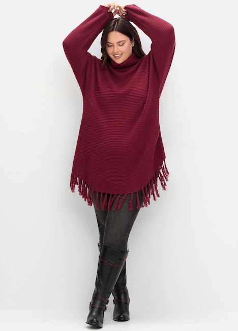 Pullover in weiter Ponchoform. Die quer gestrickte Rippstruktur verleiht ihm eine lässige und sportive Optik, der Rollkragen hält kuschelig warm. Für verspielten Boho-Charme sorgen die langen Fransen am Saum.