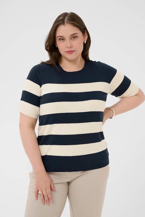 Damen-Stricktop mit kurzen Ärmeln bietet eine bequeme, lockere Passform und einen klassischen Rundhalsausschnitt. Vielseitig und angenehm – perfekt für Alltag und Büro.