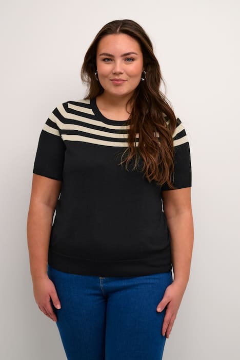 Damen-Stricktop mit kurzen Ärmeln bietet eine bequeme, lockere Passform und einen klassischen Rundhalsausschnitt. Vielseitig und angenehm – perfekt für Alltag und Büro.