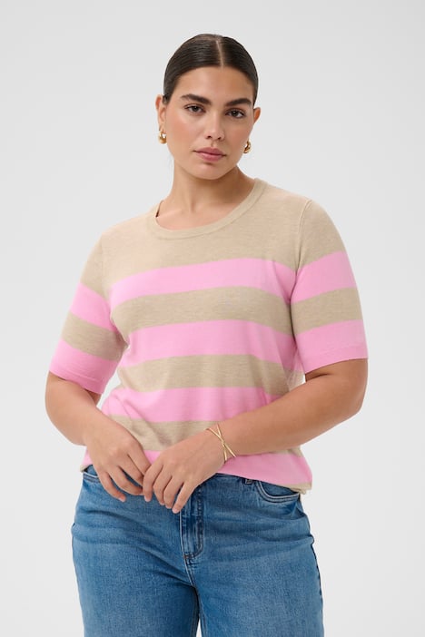 Damen-Stricktop mit kurzen Ärmeln bietet eine bequeme, lockere Passform und einen klassischen Rundhalsausschnitt. Vielseitig und angenehm – perfekt für Alltag und Büro.