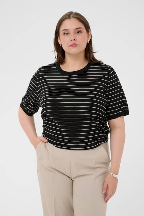 Damen-Stricktop mit kurzen Ärmeln bietet eine bequeme, lockere Passform und einen klassischen Rundhalsausschnitt. Vielseitig und angenehm – perfekt für Alltag und Büro.