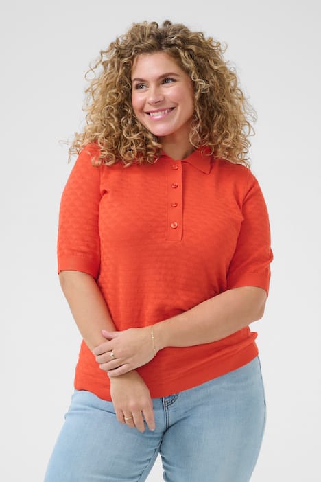 Dieses strukturierte Strick-Poloshirt hat eine gerade Passform, ellbogenlange Ärmel, klassischen Kragen und Knopfleiste. Das durchgehende Muster wirkt erhaben und geometrisch.