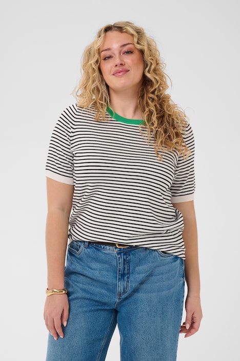 Striped T-shirt featuring a round neckline with a contrasting trim and short sleeves. The fit appears to be straight, neither tight nor oversized, and the fabric gives a smooth, finely ribbed appearance.