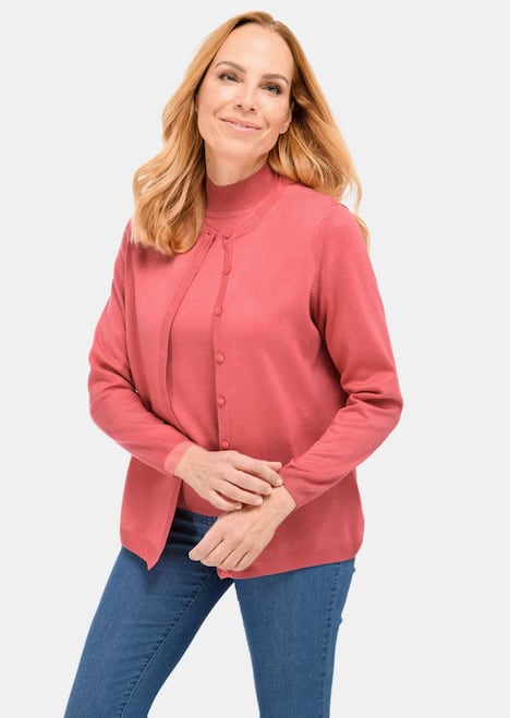 Immer in Mode! Mit dem Twinset aus Strickjacke und Pullover sind Sie bestens ausgestattet, um im Nu ein elegantes Outfit zu kreieren. Während die Strickjacke mit einem schönen Rundhalsausschnitt und aufwendigen Tubularabschlüssen gestaltet ist, präsentiert sich der Pullover mit einem breiten Stehbundkragen aus Rippstrick und schmalen Rippstrickabschlüssen am Saum und an den Ärmeln in Halbarmlänge. Ob als stilvolles Duo oder einzeln getragen – das Twinset aus Strickjacke und Pullover begeistert mit seinen vielseitigen Einsatzmöglichkeiten. Das Twinset ist ein erfolgreicher Klassiker, der in der Welt der Mode bereits Geschichte geschrieben hat. Länge Strickjacke/Pullover ca. 67 cm/63 cm in Gr. 46, ca. 63 cm/ 59 cm in Gr. 23.