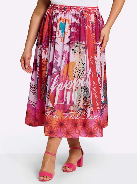 Maxirock von sheego loves miss goodlife. Das Spiel von Farben, Mustern und Schriftzügen auf weich fließendem Stoff sorgt für sommerliche Leichtigkeit. Ein elastischer Formbund bietet bequemen Tragekomfort, während der leicht ausgestellte Schnitt in Wadenlänge eine schmeichelhafte, feminine Silhouette zaubert.