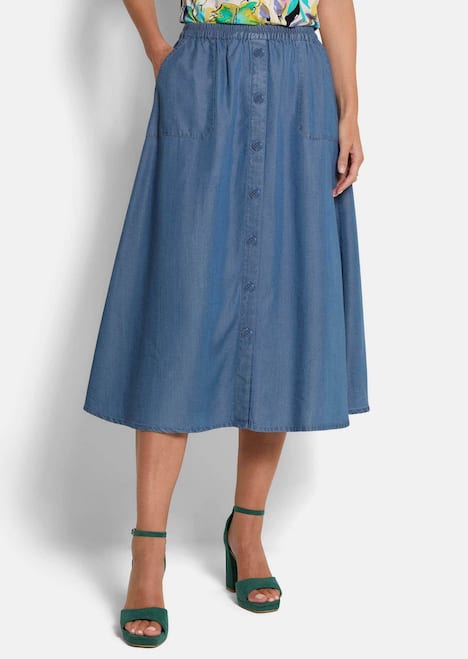 Tencel-Rock aus weich fließender, hautfreundlicher Lyocell-Qualität – trägt sich luftig-leicht, der kniebedeckende Schnitt schmeichelt der Figur. Mit bequemem Rundumschlupfbund, aufgesetzten Taschen und optischer Knopfleiste, die den Jeans-Look noch unterstreicht – perfekt für sportlich-feminine Looks!