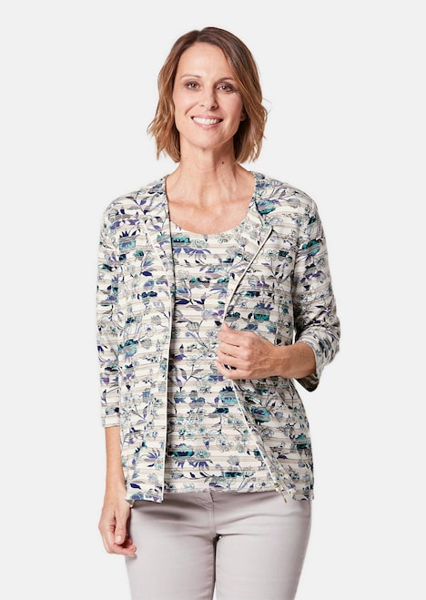 Shirtjacke mit apartem Blumendruck auf hochwertig gestreiftem Jersey. Die anschmiegsame Qualität mit Elasthan macht jede Bewegung mit und ist figurumschmeichelnd gearbeitet. Durch das softe Komfort-Material trägt sich die Jacke leicht und unkompliziert wie ein Shirt und ist auch direkt auf der Haut ein Genuss. Perfekt im Sitz zeigt sich das bedruckte Modell mit Rundhalsausschnitt, sportiven 3/4-Ärmeln und Reißverschluss. Länge ca. 69 cm in Gr. 46, ca. 65 cm in Gr. 23.