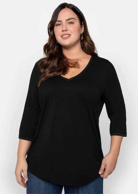 Jerseyshirt mit 3/4-Arm. Das schlichte, kombistarke Shirt zeigt sich mit V-Ausschnitt und leicht gerundetem Saum. Als feminines Finish dient die mit einer zarten Bogenkante verzierte Rippblende am Ausschnitt und am Ärmelsaum.