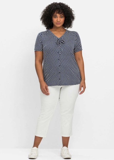 Shirt mit Allover-Punktedruck von sheego by Joe Browns. Das charmante Muster wird durch das Bindeband am V-Ausschnitt feminin ergänzt. Auch die Kräuselung an der vorverlegten Schulternaht ist ein verspieltes Detail. Das Shirt ist mit kurzen Ärmeln und einer durchgehenden Knopfleiste gearbeitet. Im Rücken sorgt die Passe mit Falte für einen schönen Fall.