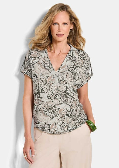 Druckshirt aus Flammenware: Der weiche Viskose-Jersey ist pflegeleicht und koffertauglich! Mit hübschen Blattornamenten bedruckt und in legerer Form mit überschnittenen Schultern und Aufschlag, Schulterriegel und Gummibündchen am Saum. V-Ausschnitt mit Kragen. Länge ca. 66 cm in Gr. 46, ca. 62 cm in Gr. 23.