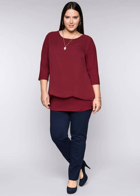 Seine doppellagige Optik macht dieses Blusenshirt mit Zipfelsaum so besonders. Während die obere Lage aus zartem, leicht transparentem Chiffon besteht, überzeugen die untere Lage und der 3/4-Arm durch ihre bequeme Qualität aus weichem, elastischem Viskosejersey. Mit femininem Rundhalsausschnitt. Eine perfekte Ergänzung zu modischen Businessoutfits.