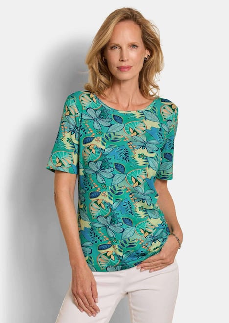Druckshirt aus weichem Viskose-Jersey – der erfrischende Print mit Blättern und Blüten passt perfekt zu entspannten Jeans-Looks! In gerader Passform mit Halbarm und U-Boot-Ausschnitt sitzt das Modell bequem und begleitet Sie den ganzen Tag hindurch! Länge ca. 64 cm in Gr. 46, ca. 60 cm in Gr. 23.